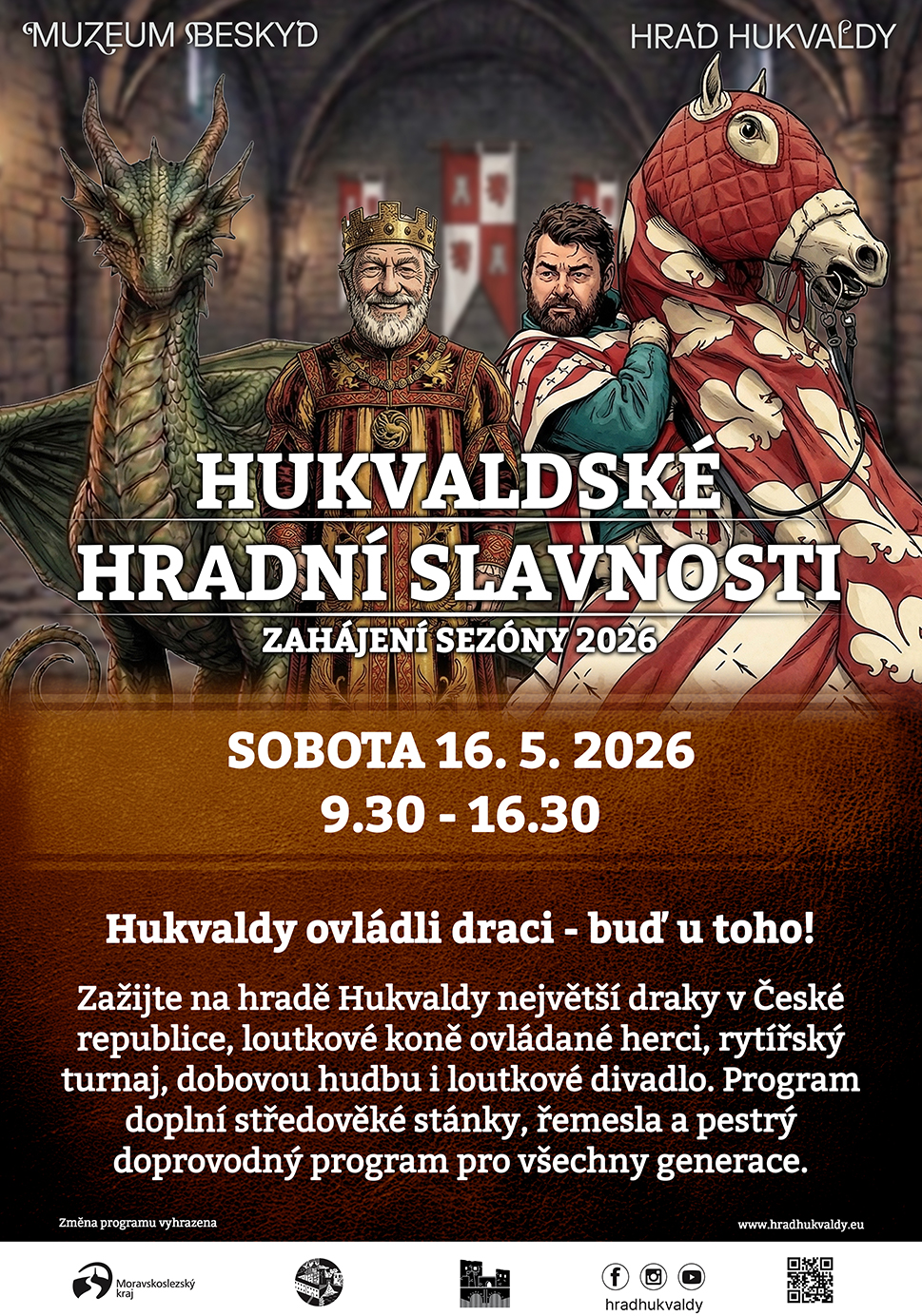 Zažijte na hradě Hukvaldy největší draky v České republice, loutkové koně ovládané herci, rytířský turnaj, dobovou hudbu i loutkové divadlo. Program doplní středověké stánky, řemesla a pestrý doprovodný program pro všechny generace.
